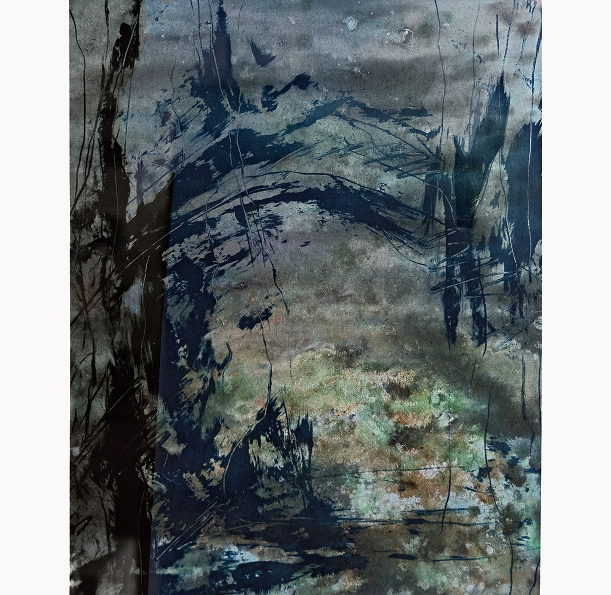 Tolerance by Barbara Mason is a solarplate intaglio print featuring dark black ink over a unique Japanese paper with shades of brown, tan, green, and blue. This artwork was created through a chine collé printmaking process and set in a black frame.