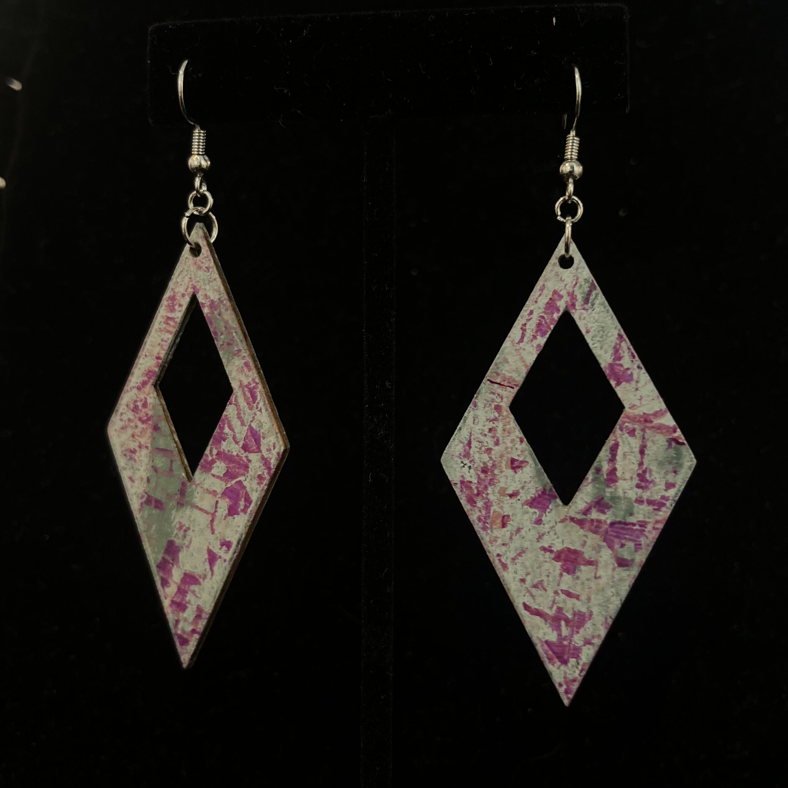 Add delicate color and artisan style to your jewelry collection with these handmade wooden diamond-shaped earrings by Oregon artist Sue Gosselin. Featuring a unique collage-style print with white, pink, and subtle specks of green, these earrings bring a soft yet modern boho flair to any outfit.